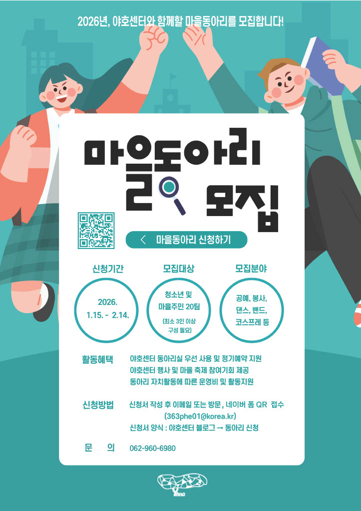 마을동아리 신청안내○ 신청기간 : 2026. 1. 15.(목) ~ 2. 14.(토) 17:00 까지
